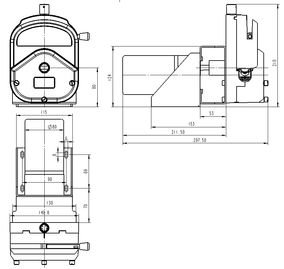 Product Model Number of Pump Head Rollers Optional Channels Tubing Speed Range (RPM) Flow Range (mL/min) Gxx-4Z+YZ35-13 3 1 73# ≤600 ≤7800 82# ≤12000 Dimensions