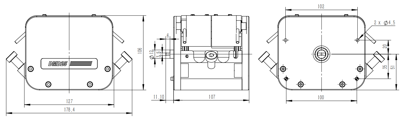 泵頭型号 外(wài)殼材料 滾輪材料 泵頭滾輪數(shù) 适用(yòng)軟管 适用(yòng)轉速(RPM) 參考流量(mL/min) 重量(KG) DMD25 6061鋁合金(jīn) 304不(bù)鏽鋼 6 1.6×2.4 0.1-350 0.042-150 2.5 3.2×2.4 0.23-800 15# 0.43-1500 24# 0.7-2400 35# 0.85-2950 36# 1.2-4170 外(wài)形尺寸